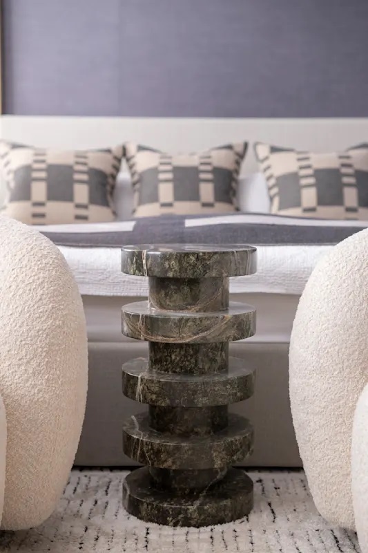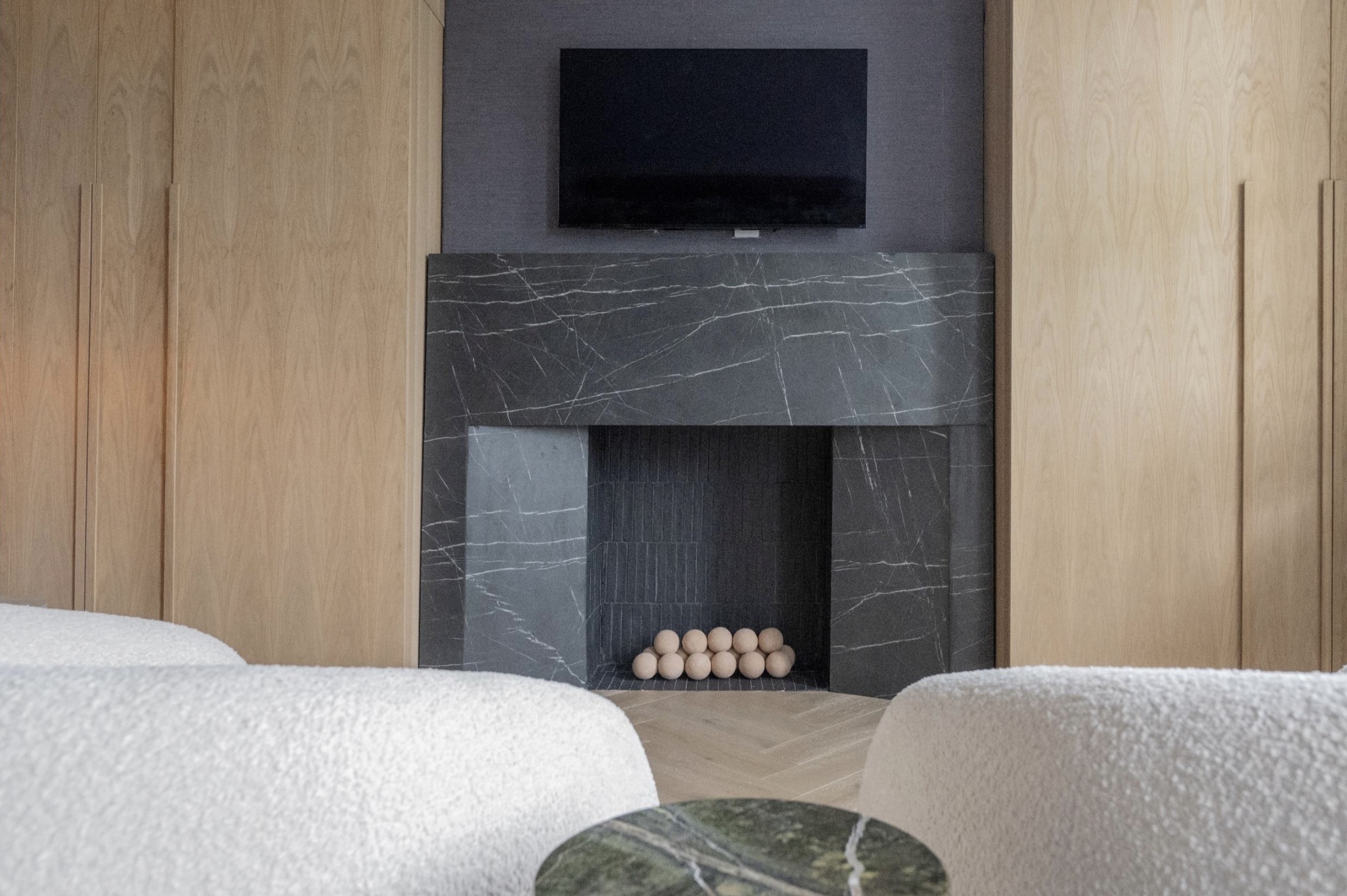 Let’s talk organic: as well as the oak wood used for the customised wardrobe doors, flooring, bed, and solid marble side table, we went big on the fireplace! We created an ambitious, customised faux fireplace which has now introduced form into the space. It’s oversized, bold and an absolute stunner! We stacked the mini brick matt finish ceramic tiles for a contemporary finish. Finally, we introduced concealed lighting within the fireplace which adds warmth and ambience to the space towards dusk.