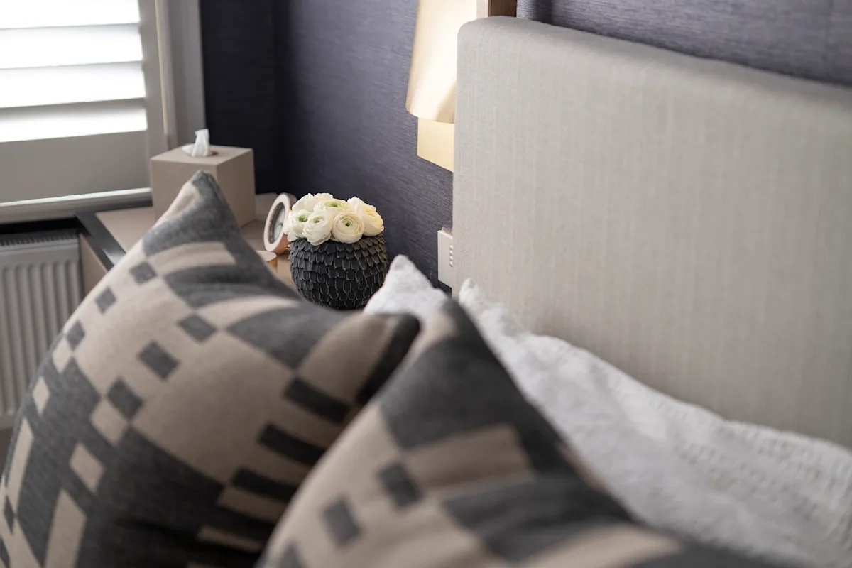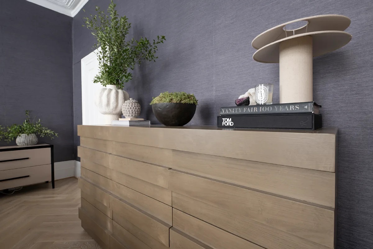 By using oversized boucle swivel chairs, it allows flexibility for the children to come and talk with their parents but by having separate chairs (as opposed to 1 long seating bench), clothes are now stored away and the room is inviting and immediately ready to welcome you to relax. The walls were previously painted taupe, a safe but not very exciting option. We added drama to the space by introducing a luxury grasscloth wall covering onto all walls. This instantly added personality and depth to the room. The couple wanted to take full advantage of the height of the room and trusted us to install a contemporary customised 4 poster bed which immediately adds the wow factor to this space. This star piece is a celebration of simple forms and luxe materials, solid crafted oak complimented by an upholstered linen headboard. We achieved all of this whilst sticking closely to the brief - this super king bed has a full mechanical spring frame to access under bed storage.